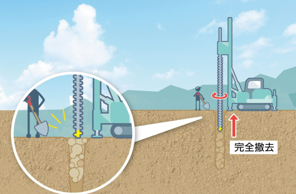 杭の周囲をオーガーで掘削しながら地盤を緩め、引き抜きやすくする工法です。コンクリート杭や固い地盤など、抵抗が大きいケースに適しており、他の工法と組み合わせて使用されることもあります。