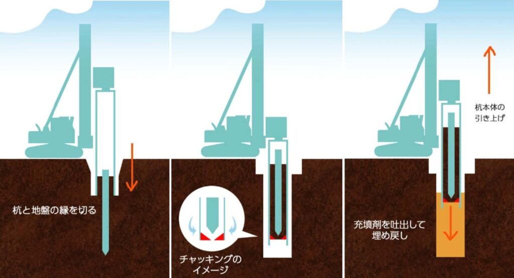 杭の周囲にケーシングを回転させながら圧入し、杭と地盤を縁切りしたうえで引き抜く工法です。地盤との摩擦抵抗が大きい場合や、周辺への影響を抑えたい現場で採用されます。